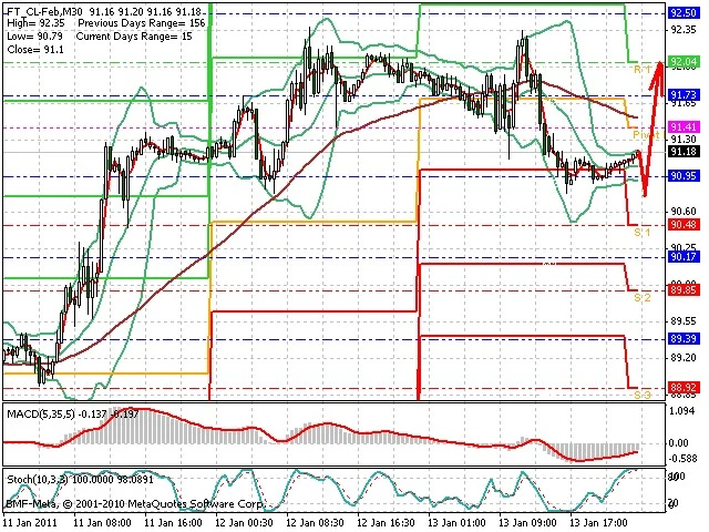 Předpokládaný pohyb pro dnešní den LONG. Případné vstupy do obchodu z hladiny 90.75 s předpokládaným cílem 92, případně až 92.5. Proražení hladiny 90.4 může vést k pohybu s pravděpodobným cílem 89.25 až 88.