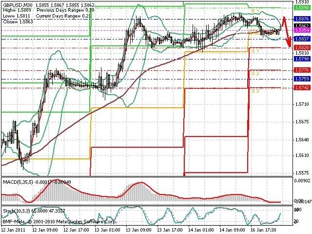 Předpokládaný pohyb pro dnešní den SHORT. Případné vstupy do obchodu z hladiny 1.588 s předpokládaným cílem 1.581, případně až 1.5775. Proražení hladiny 1.589 může vést k pohybu s pravděpodobným cílem 1.5915 až 1.599.