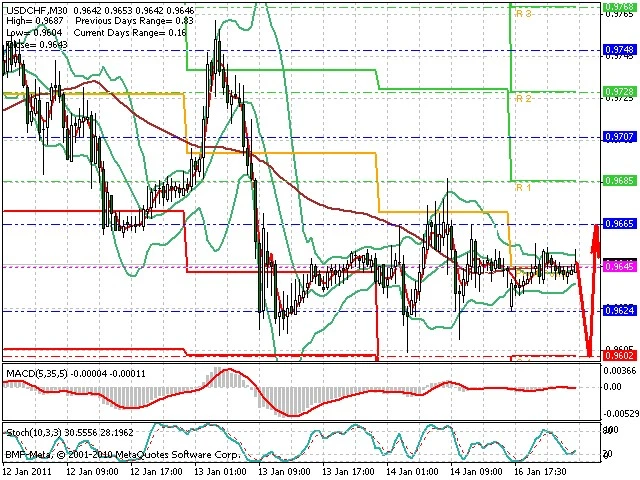 Předpokládaný pohyb pro dnešní den LONG. Případné vstupy do obchodu z hladiny 0.96 s předpokládaným cílem 0.969, případně až 0.976. Proražení hladiny 0.96 může vést k pohybu s pravděpodobným cílem 0.955 až 0.95.