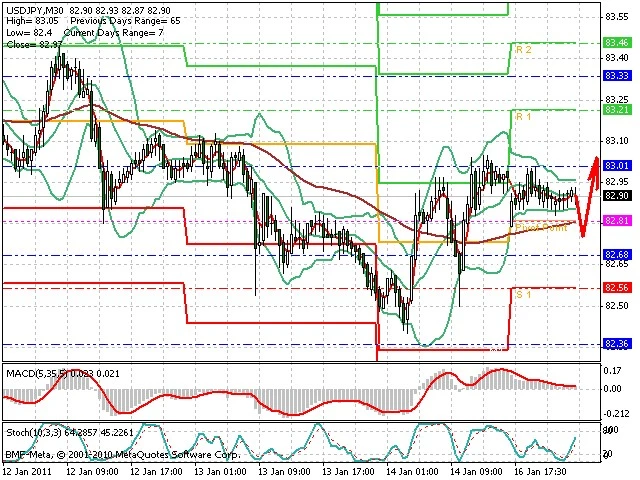 Předpokládaný pohyb pro dnešní den LONG. Případné vstupy do obchodu z hladiny 82.75 s předpokládaným cílem 83.15, případně až 83.5. Proražení hladiny 82.65 může vést k pohybu s pravděpodobným cílem 82.4 až 82.2.