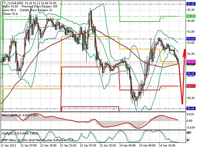 Předpokládaný pohyb pro dnešní den LONG. Případné vstupy do obchodu z hladiny 90.1 s předpokládaným cílem 92, případně až 92.5. Proražení hladiny 90.1 může vést k pohybu s pravděpodobným cílem 89.8 až 89.25.