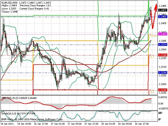 Předpokládaný pohyb pro dnešní den LONG. Případné vstupy do obchodu z hladiny 1.3425 s předpokládaným cílem 1.35, případně až 1.357. Proražení hladiny 1.3425 může vést k pohybu s pravděpodobným cílem 1.336 až 1.3315.