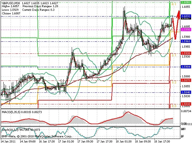 Předpokládaný pohyb pro dnešní den LONG. Případné vstupy do obchodu z hladiny 1.5975 s předpokládaným cílem 1.606, případně až 1.612. Proražení hladiny 1.5965 může vést k pohybu s pravděpodobným cílem 1.5875 až 1.574.
