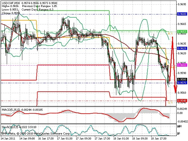 Předpokládaný pohyb pro dnešní den SHORT. Případné vstupy do obchodu z hladiny 0.9645 s předpokládaným cílem 0.9555, případně až 0.95. Proražení hladiny 0.9645 může vést k pohybu s pravděpodobným cílem 0.969 až 0.9725.