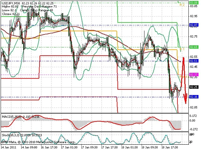 Předpokládaný pohyb pro dnešní den SHORT. Případné vstupy do obchodu z hladiny 82.55 s předpokládaným cílem 81.9, případně až 81.7. Proražení hladiny 82.65 může vést k pohybu s pravděpodobným cílem 82.8 až 83.05.