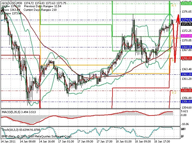 Předpokládaný pohyb pro dnešní den LONG. Případné vstupy do obchodu z hladiny 1 365 s předpokládaným cílem 1 378, případně až 1 387. Proražení hladiny 1 365 může vést k pohybu s pravděpodobným cílem 1 357 až 1 350.