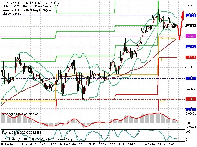 Předpokládaný pohyb pro dnešní den LONG. Případné vstupy do obchodu z hladiny 1.355 s předpokládaným cílem 1.364, případně až 1.368. Proražení hladiny 1.354 může vést k pohybu s pravděpodobným cílem 1.3465 až 1.342.