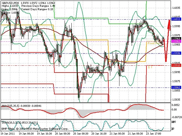 Předpokládaný pohyb pro dnešní den LONG. Případné vstupy do obchodu z hladiny 1.592 s předpokládaným cílem 1.6035, případně až 1.606. Proražení hladiny 1.591 může vést k pohybu s pravděpodobným cílem 1.5835 až 1.5785.