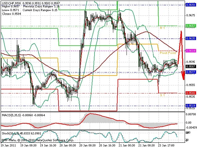 Předpokládaný pohyb pro dnešní den SHORT. Případné vstupy do obchodu z hladiny 0.965 s předpokládaným cílem 0.957, případně až 0.955. Proražení hladiny 0.965 může vést k pohybu s pravděpodobným cílem 0.969 až 0.973.