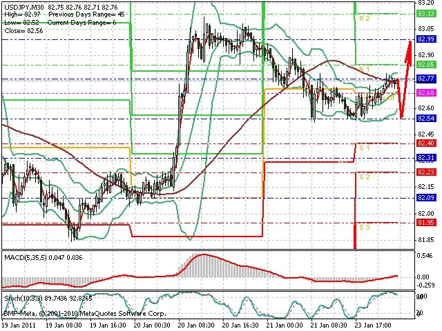 Předpokládaný pohyb pro dnešní den LONG. Případné vstupy do obchodu z hladiny 82.55 s předpokládaným cílem 82.95, případně až 83.1. Proražení hladiny 82.5 může vést k pohybu s pravděpodobným cílem 82.35 až 82.15.