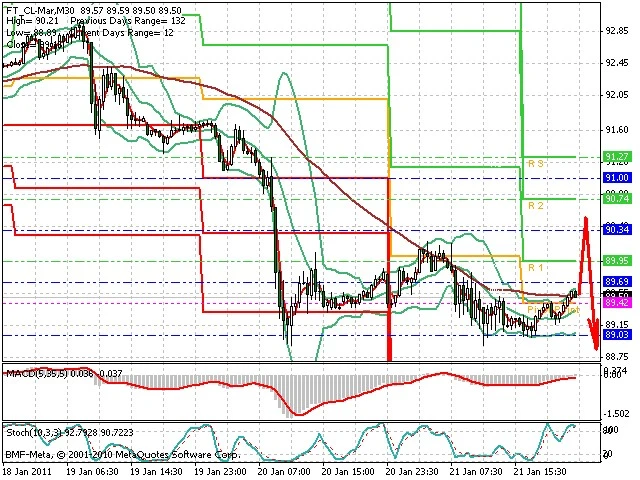 Předpokládaný pohyb pro dnešní den SHORT. Případné vstupy do obchodu z hladiny 90.5 s předpokládaným cílem 88.6, případně až 88. Proražení hladiny 90.5 může vést k pohybu s pravděpodobným cílem 91.15 až 92.1.