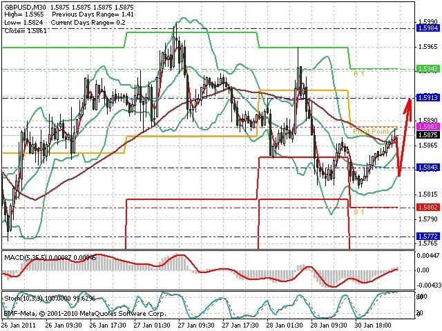 Předpokládaný pohyb pro dnešní den LONG. Případné vstupy do obchodu z hladiny 1.5835 s předpokládaným cílem 1.594, případně až 1.5985. Proražení hladiny 1.5825 může vést k pohybu s pravděpodobným cílem 1.5775 až 1.572.