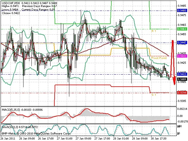 Předpokládaný pohyb pro dnešní den SHORT. Případné vstupy do obchodu z hladiny 0.945 s předpokládaným cílem 0.94, případně až 0.9345. Proražení hladiny 0.945 může vést k pohybu s pravděpodobným cílem 0.9475 až 0.9525.