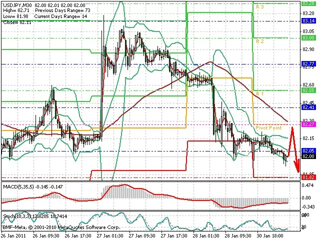 Předpokládaný pohyb pro dnešní den SHORT. Případné vstupy do obchodu z hladiny 82.25 s předpokládaným cílem 81.85, případně až 81.65. Proražení hladiny 82.3 může vést k pohybu s pravděpodobným cílem 82.6 až 82.8.