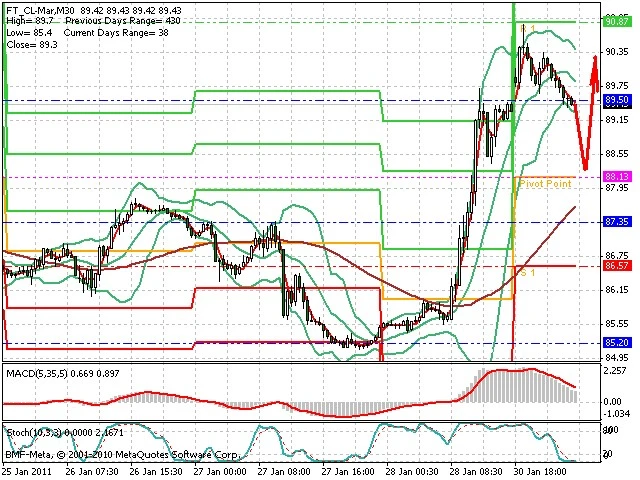 Předpokládaný pohyb pro dnešní den LONG. Případné vstupy do obchodu z hladiny 88.35 s předpokládaným cílem 91.5, případně až 92.45. Proražení hladiny 88.35 může vést k pohybu s pravděpodobným cílem 87.8 až 86.45.