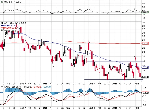 V pátek 28. 1. index volatility VIX explodoval a uzavřel na hodnotě 20. V pondělí, kdy se akcie začaly vracet zpět, zůstal vysoko. Při úterní rally spadl zpět do pásma, ve kterém je poslední dva měsíce. Přestože VIX naznačoval možnou změnu na medvědí pohyb, je nyní zpět v býčím až neutrálním pásmu.