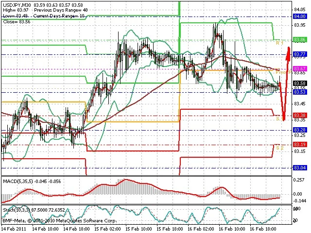 Předpokládaný pohyb pro dnešní den LONG. Případné vstupy do obchodu z hladiny 83.35 s předpokládaným cílem 84, případně až 84.15. Proražení hladiny 83.3 může vést k pohybu s pravděpodobným cílem 83.15 až 82.75.