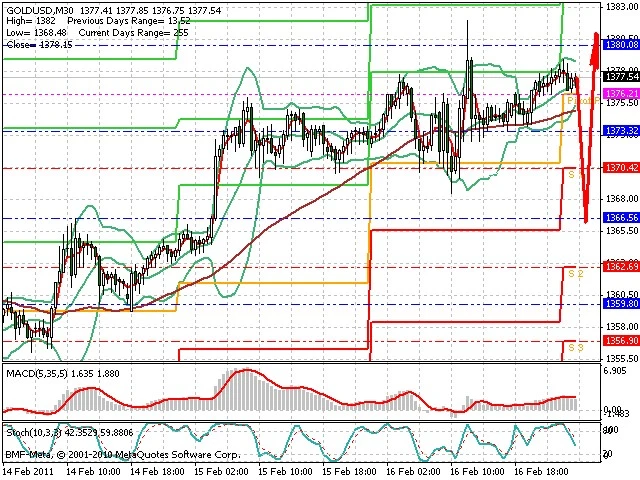 Předpokládaný pohyb pro dnešní den LONG. Případné vstupy do obchodu z hladiny 1 366 s předpokládaným cílem 1 380, případně až 1 390. Proražení hladiny 1 366 může vést k pohybu s pravděpodobným cílem 1 356 až 1 350.
