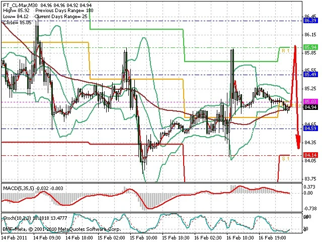 Předpokládaný pohyb pro dnešní den SHORT. Případné vstupy do obchodu z hladiny 86 s předpokládaným cílem 83.5, případně až 82. Proražení hladiny 86 může vést k pohybu s pravděpodobným cílem 87.9 až 88.5.