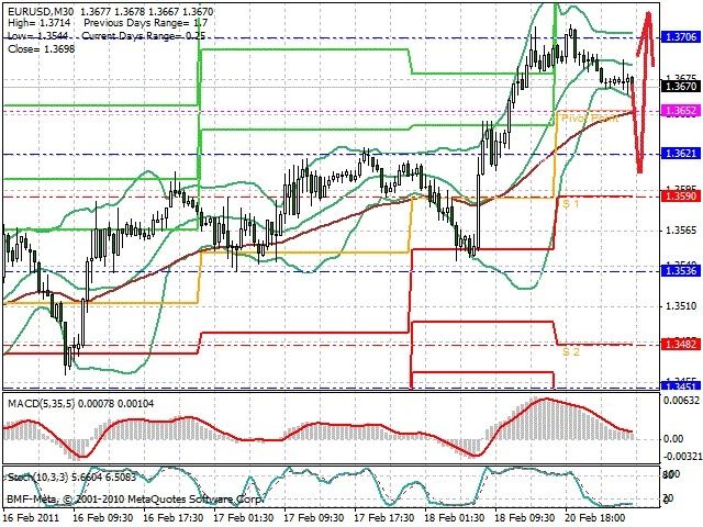 Předpokládaný pohyb pro dnešní den LONG. Případné vstupy do obchodu z hladiny 1.3615 s předpokládaným cílem 1.3745, případně až 1.377. Proražení hladiny 1.3605 může vést k pohybu s pravděpodobným cílem 1.354 až 1.35.
