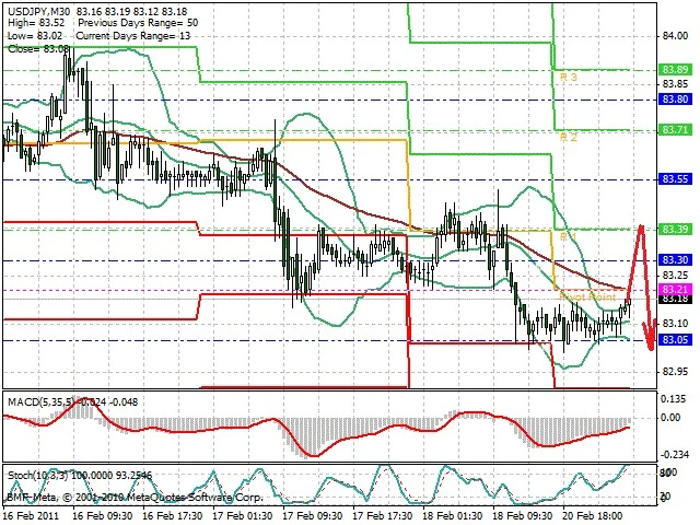 Předpokládaný pohyb pro dnešní den SHORT. Případné vstupy do obchodu z hladiny 83.4 s předpokládaným cílem 82.95, případně až 82.7. Proražení hladiny 83.45 může vést k pohybu s pravděpodobným cílem 83.75 až 84.