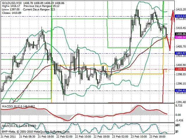 Předpokládaný pohyb pro dnešní den LONG. Případné vstupy do obchodu z hladiny 1 405 s předpokládaným cílem 1 418, případně až 1 424. Proražení hladiny 1 405 může vést k pohybu s pravděpodobným cílem 1 395 až 1 387.