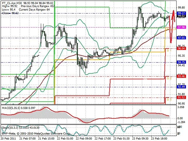 Předpokládaný pohyb pro dnešní den LONG. Případné vstupy do obchodu z hladiny 96.73 s předpokládaným cílem 100.5, případně až 101.7. Proražení hladiny 96.73 může vést k pohybu s pravděpodobným cílem 95.5 až 94.
