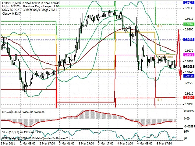 Předpokládaný pohyb pro dnešní den SHORT. Případné vstupy do obchodu z hladiny 0.93 s předpokládaným cílem 0.92, případně až 0.9155. Proražení hladiny 0.93 může vést k pohybu s pravděpodobným cílem 0.9355 až 0.94.