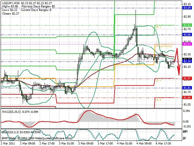 Předpokládaný pohyb pro dnešní den SHORT. Případné vstupy do obchodu z hladiny 82.4 s předpokládaným cílem 82.05, případně až 81.95. Proražení hladiny 82.45 může vést k pohybu s pravděpodobným cílem 82.6 až 82.8.