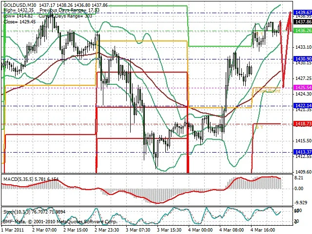 Předpokládaný pohyb pro dnešní den LONG. Případné vstupy do obchodu z hladiny 1 425 s předpokládaným cílem 1 439, případně až 1 448. Proražení hladiny 1 425 může vést k pohybu s pravděpodobným cílem 1 412 až 1 400.