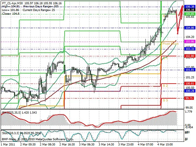 Předpokládaný pohyb pro dnešní den LONG. Případné vstupy do obchodu z hladiny 104.5 s předpokládaným cílem 107.5, případně až 108.15. Proražení hladiny 104.5 může vést k pohybu s pravděpodobným cílem 103 až 102.45.