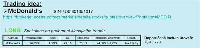 Očekáváme, že McD potvrdí změnu krátkodobého trendu a vzdálí se (tzn. posílí) od klesající trendové linie (nyní na 75,7 USD).