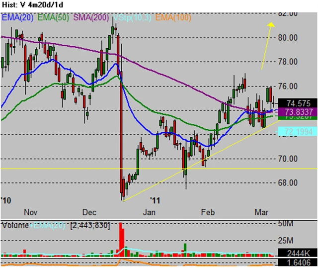 Akcie společnosti Visa se dostaly opět nad 200denní klouzavý průmer a vykazují relativní sílu, a tedy zájem investorů. Technická analýza naznačuje možné růsty.