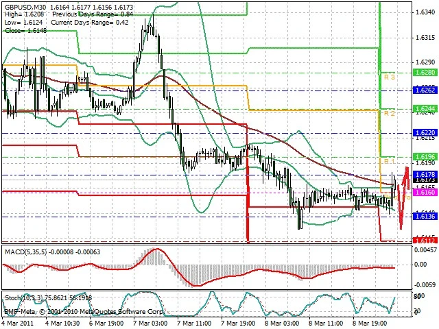 Předpokládaný pohyb pro dnešní den LONG. Případné vstupy do obchodu z hladiny 1.612 s předpokládaným cílem 1.6185, případně až 1.621. Proražení hladiny 1.611 může vést k pohybu s pravděpodobným cílem 1.6075 až 1.603.