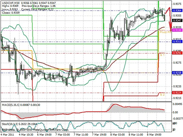 Předpokládaný pohyb pro dnešní den SHORT. Případné vstupy do obchodu z hladiny 0.937 s předpokládaným cílem 0.933, případně až 0.931. Proražení hladiny 0.937 může vést k pohybu s pravděpodobným cílem 0.939 až 0.9435.