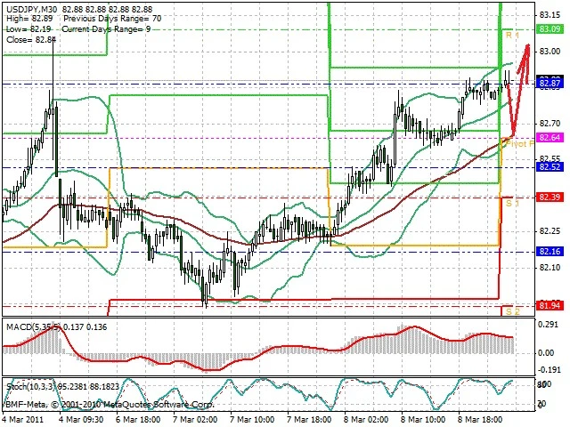 Předpokládaný pohyb pro dnešní den LONG. Případné vstupy do obchodu z hladiny 82.65 s předpokládaným cílem 83.05, případně až 83.3. Proražení hladiny 82.6 může vést k pohybu s pravděpodobným cílem 82.45 až 82.2.