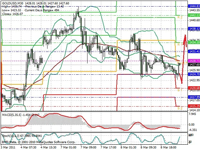Předpokládaný pohyb pro dnešní den LONG. Případné vstupy do obchodu z hladiny 1 422 s předpokládaným cílem 1 437, případně až 1 441. Proražení hladiny 1 422 může vést k pohybu s pravděpodobným cílem 1 417 až 1 411.