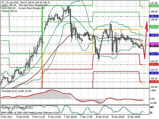 Předpokládaný pohyb pro dnešní den LONG. Případné vstupy do obchodu z hladiny 103.5 s předpokládaným cílem 105.8, případně až 106.9. Proražení hladiny 103.5 může vést k pohybu s pravděpodobným cílem 102.2 až 100.1.
