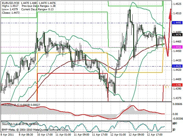 Předpokládaný pohyb pro dnešní den LONG. Případné vstupy do obchodu z hladiny 1.4445 s předpokládaným cílem 1.452, případně až 1.455. Proražení hladiny 1.4435 může vést k pohybu s pravděpodobným cílem 1.438 až 1.4345.