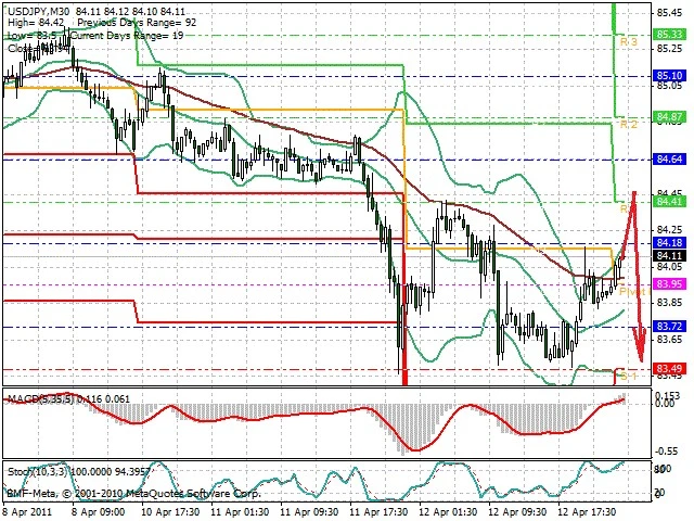 Předpokládaný pohyb pro dnešní den SHORT. Případné vstupy do obchodu z hladiny 84.45 s předpokládaným cílem 83.5, případně až 83.2. Proražení hladiny 84.5 může vést k pohybu s pravděpodobným cílem 84.75 až 85.15.