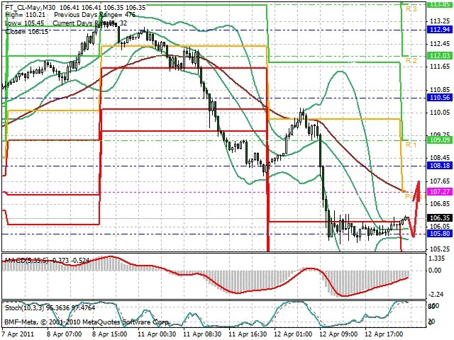 Předpokládaný pohyb pro dnešní den LONG. Případné vstupy do obchodu z hladiny 105.7 s předpokládaným cílem 107.65, případně až 108.3. Proražení hladiny 105.7 může vést k pohybu s pravděpodobným cílem 103.1 až 101.1.