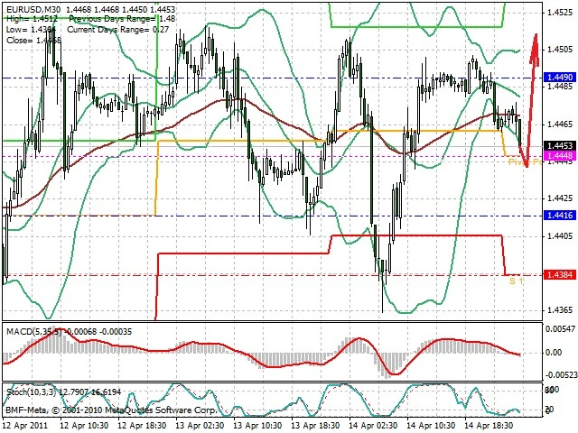 Předpokládaný pohyb pro dnešní den LONG. Případné vstupy do obchodu z hladiny 1.444 s předpokládaným cílem 1.4515, případně až 1.455. Proražení hladiny 1.443 může vést k pohybu s pravděpodobným cílem 1.4375 až 1.435.
