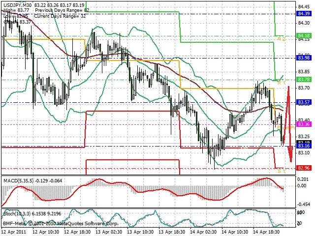 Předpokládaný pohyb pro dnešní den SHORT. Případné vstupy do obchodu z hladiny 83.7 s předpokládaným cílem 83, případně až 82.75. Proražení hladiny 83.8 může vést k pohybu s pravděpodobným cílem 84 až 84.3.