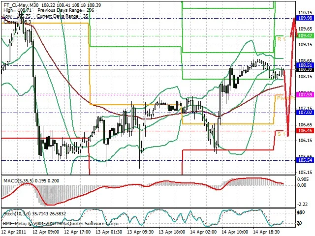 Předpokládaný pohyb pro dnešní den LONG. Případné vstupy do obchodu z hladiny 106.2 s předpokládaným cílem 110, případně až 110.85. Proražení hladiny 106.2 může vést k pohybu s pravděpodobným cílem 105 až 103.2.