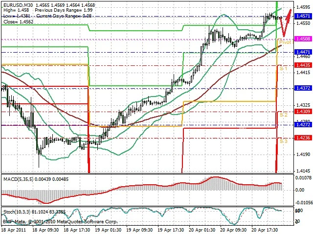 Předpokládaný pohyb pro dnešní den LONG. Případné vstupy do obchodu z hladiny 1.451 s předpokládaným cílem 1.459, případně až 1.463. Proražení hladiny 1.45 může vést k pohybu s pravděpodobným cílem 1.4445 až 1.441