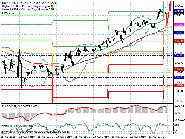 Předpokládaný pohyb pro dnešní den LONG. Případné vstupy do obchodu z hladiny 1.6395 s předpokládaným cílem 1.6475, případně až 1.65. Proražení hladiny 1.6385 může vést k pohybu s pravděpodobným cílem 1.635 až 1.631.