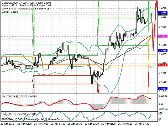Předpokládaný pohyb pro dnešní den LONG. Případné vstupy do obchodu z hladiny 1.4595 s předpokládaným cílem 1.4735, případně až 1.48. Proražení hladiny 1.458 může vést k pohybu s pravděpodobným cílem 1.4505 až 1.4466.