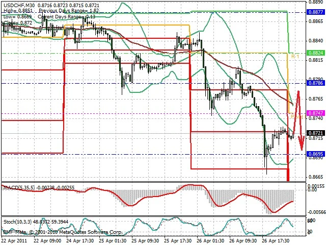 Předpokládaný pohyb pro dnešní den SHORT. Případné vstupy do obchodu z hladiny 0.878 s předpokládaným cílem 0.87, případně až 0.867. Proražení hladiny 0.878 může vést k pohybu s pravděpodobným cílem 0.883 až 0.885.