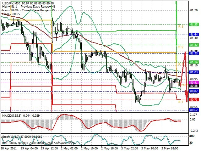 Předpokládaný pohyb pro dnešní den SHORT. Případné vstupy do obchodu z hladiny 81.25 s předpokládaným cílem 80.7, případně až 80.3. Proražení hladiny 81.25 může vést k pohybu s pravděpodobným cílem 81.45 až 81.7.