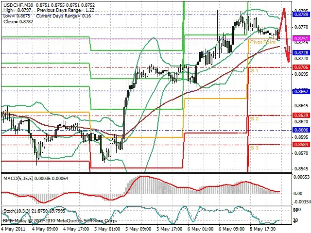 Předpokládaný pohyb pro dnešní den SHORT. Případné vstupy do obchodu z hladiny 0.88 s předpokládaným cílem 0.8715, případně až 0.8675. Proražení hladiny 0.88 může vést k pohybu s pravděpodobným cílem 0.8835 až 0.8875.